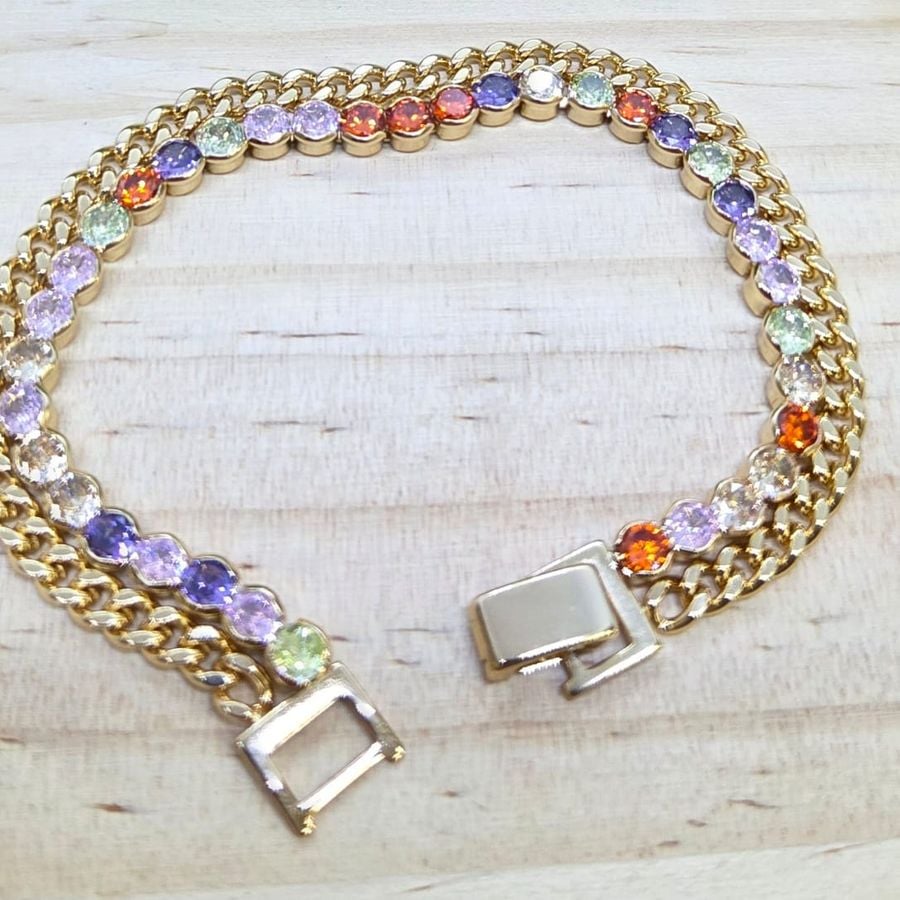 Pulsera de doble cadena fina con una hilera central de cristales multicolor. Precio por docena.