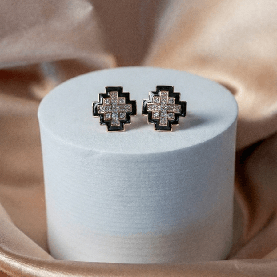 Aretes Broquel de Cruz Geométrica con Pavé de Cristales y Esmalte Negro