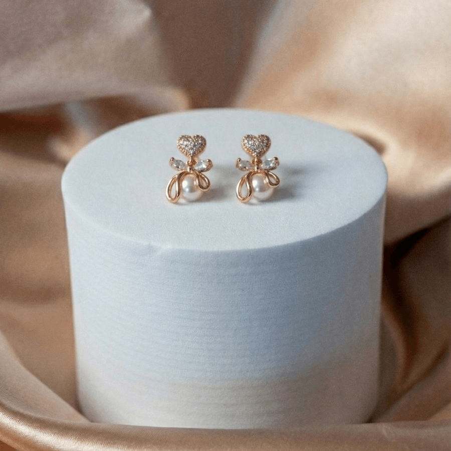 Añada un toque de romance y elegancia a su estilo con estos exquisitos aretes colgantes en tono dorado. El diseño comienza en el lóbulo con un delicado broquel en forma de corazón, resplandeciente con micro-pavé de circonias cúbicas. Debajo del corazón, un femenino lazo o moño dorado, acentuado con cristales adicionales de corte marquise, sostiene una lustrosa perla blanca que cuelga suavemente. Estos aretes tienen un hermoso movimiento y son perfectos para ocasiones especiales, eventos nupciales, o para elevar un atuendo clásico con un brillo sofisticado. El precio mencionado es por docena.