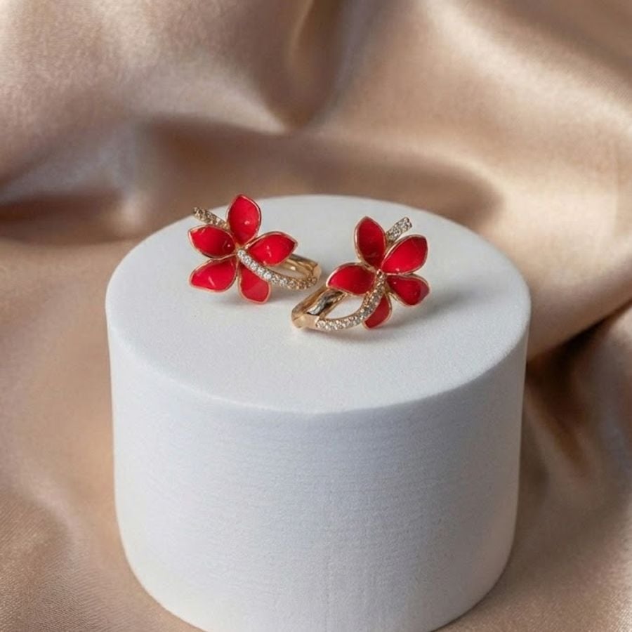 Un diseño vibrante que combina la intensidad del color rojo con la elegancia del oro y el brillo de la pedrería. Estos aretes presentan dos flores de esmalte rojo unidas por una delicada rama curvada, decorada con micro-circones que aportan un toque de luz orgánica. El precio indicado es por docena.