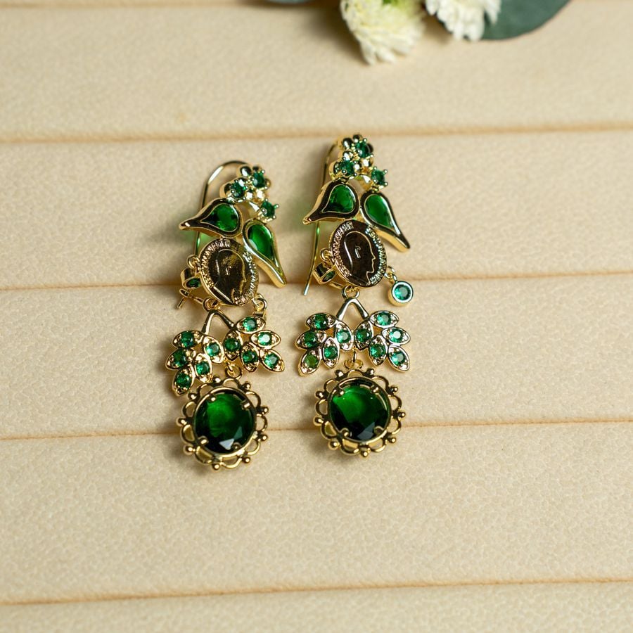 Aretes largos con detalles verdes y moneda central. Brillantes, elegantes y con un diseño moderno que atrae todas las miradas.