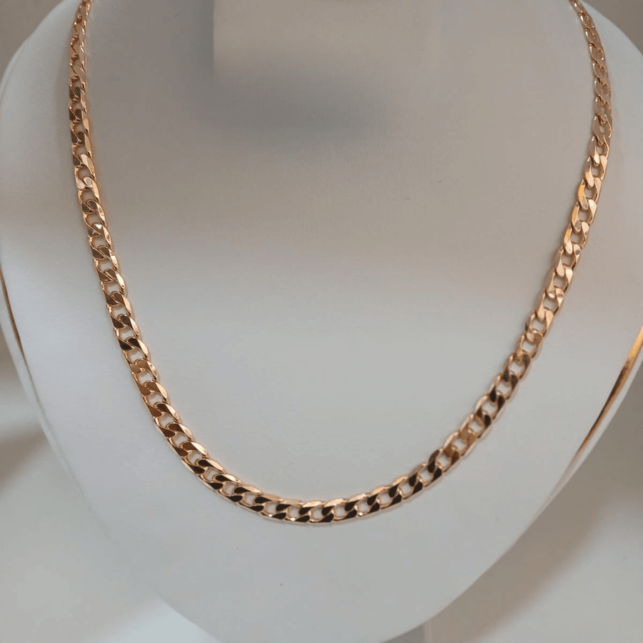 Cadena de eslabones tipo Curb o Cubana, de grosor mediano a fuerte, en tono oro rosa. El precio es por docena.