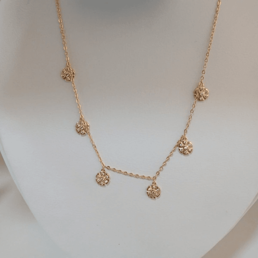 Cadena delicada con múltiples charms de diseño floral/copo de nieve con circonitas espaciados a lo largo. El precio es por docena.