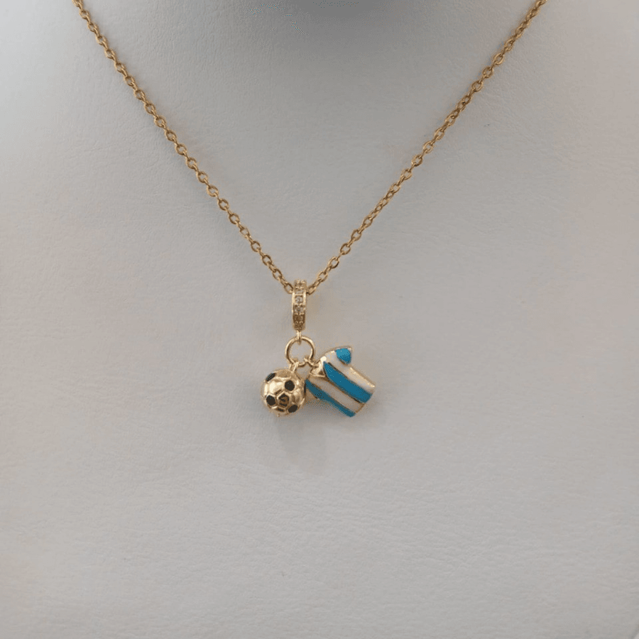 Colgante con dos charms: un balón de fútbol y una camiseta a rayas celestes y blancas con esmalte. El precio es por docena.