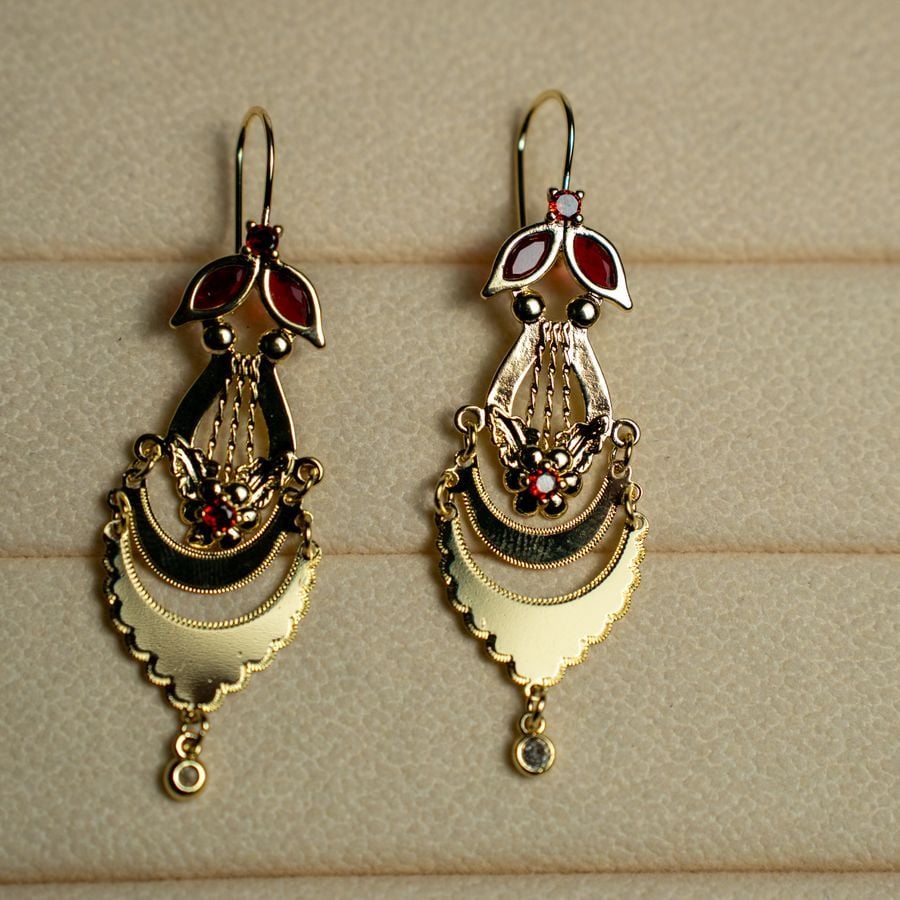 Aretes dorados con flor roja , diseño colgante, brillante y sofisticado.