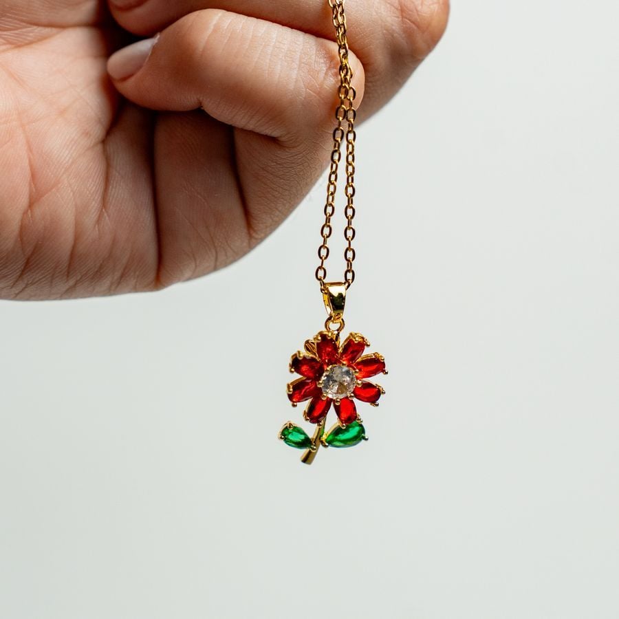 Collar elaborado en acero inoxidable dorado con dije de flor roja. Su diseño delicado y brillante combina elegancia con un toque de color, creando una pieza moderna, resistente y perfecta para realzar cualquier look con estilo y frescura.
