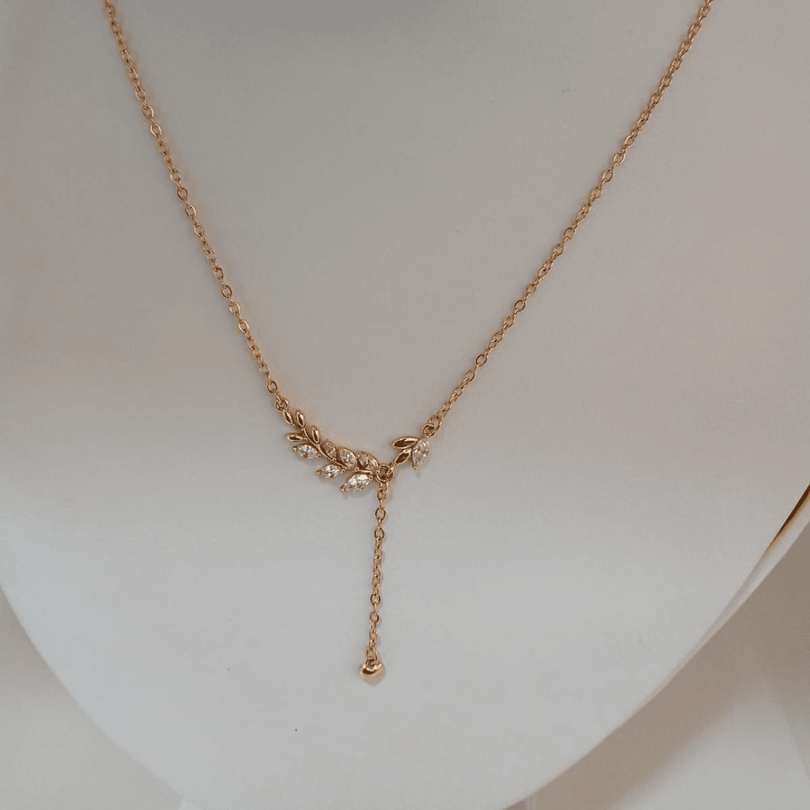 Collar de cadena fina con colgante horizontal en forma de hojas/rama con circonitas, y una caída (dangle) simple. El precio es por docena.