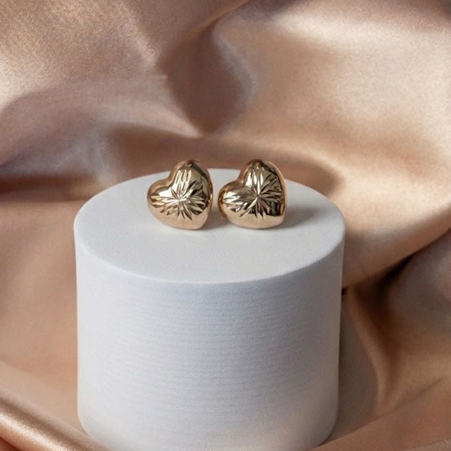Esta es una versión moderna y llamativa del clásico corazón. Estos aretes destacan por su acabado de espejo en oro amarillo y un espectacular grabado central en forma de estrella o sol que crea un efecto visual de profundidad y brillo dinámico. El precio indicado es por docena.