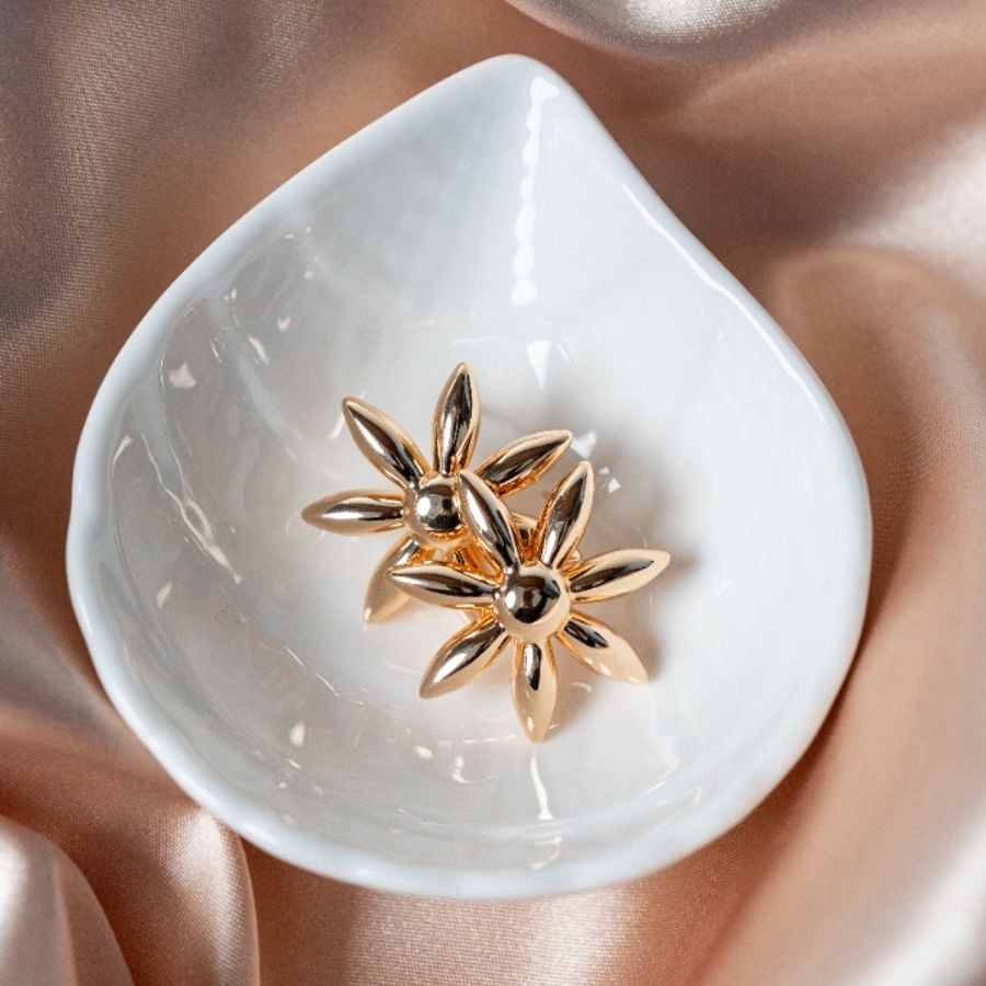Añade un toque de sofisticación y brillo a tu colección con estos hermosos aretes en forma de flor. Su diseño tridimensional con ocho pétalos puntiagudos y un centro esférico, todo en un acabado dorado pulido, captura y refleja la luz de manera espectacular. Son el accesorio perfecto para realzar cualquier atuendo, desde un look de oficina hasta un vestido de noche. El precio indicado es por docena.