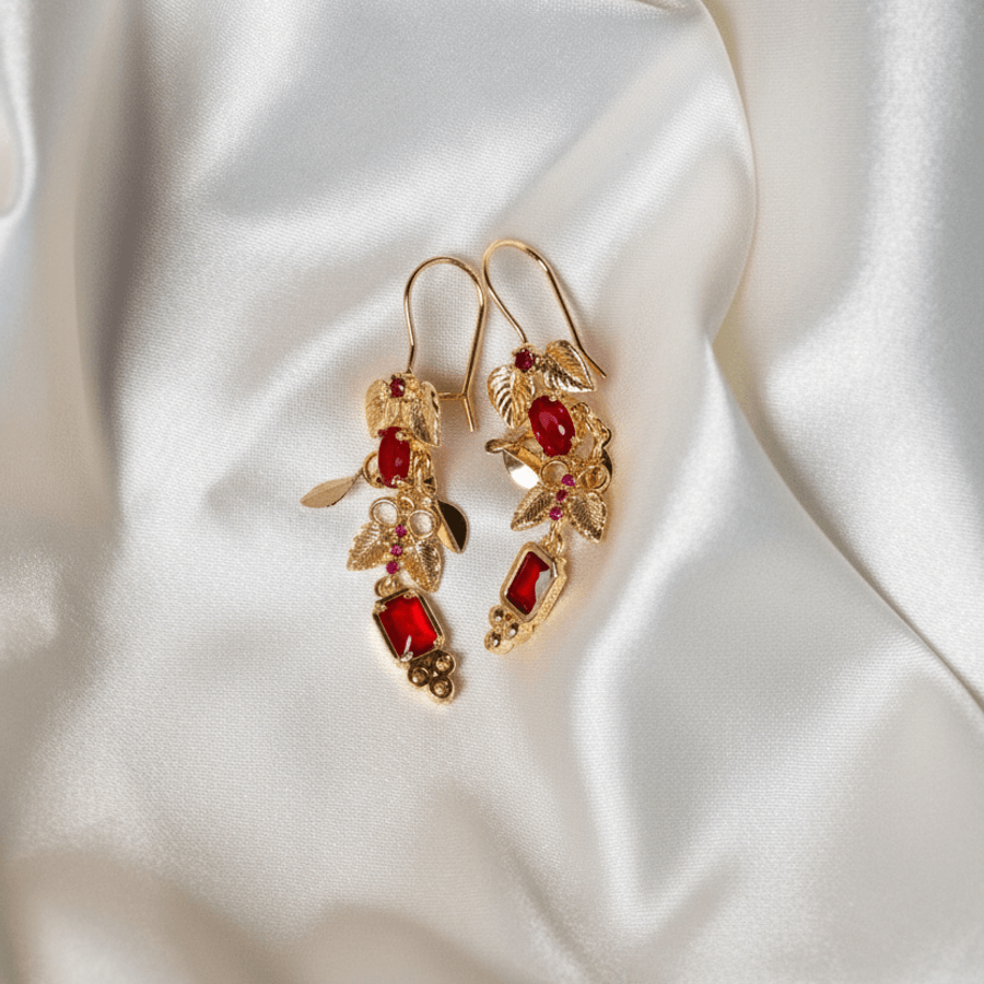 Una pieza diseñada para cautivar. Estos pendientes combinan la elegancia del oro con vibrantes cristales en color rojo rubí que simbolizan energía y distinción. Destacan por sus detalles orgánicos de hojas doradas y una estructura de cascada que culmina en un cristal rectangular de corte impecable. Su diseño artesanal aporta un brillo cálido y audaz, convirtiéndolos en el complemento ideal para resaltar la seguridad y el estilo de quien los porta. El precio indicado es por docena.