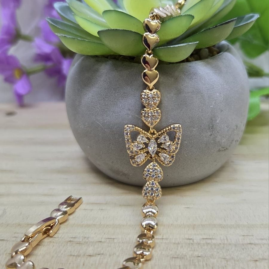 Elegante diseño que combina una hilera de eslabones en forma de corazón con una mariposa central detallada en cristales brillantes. El precio es por docena.