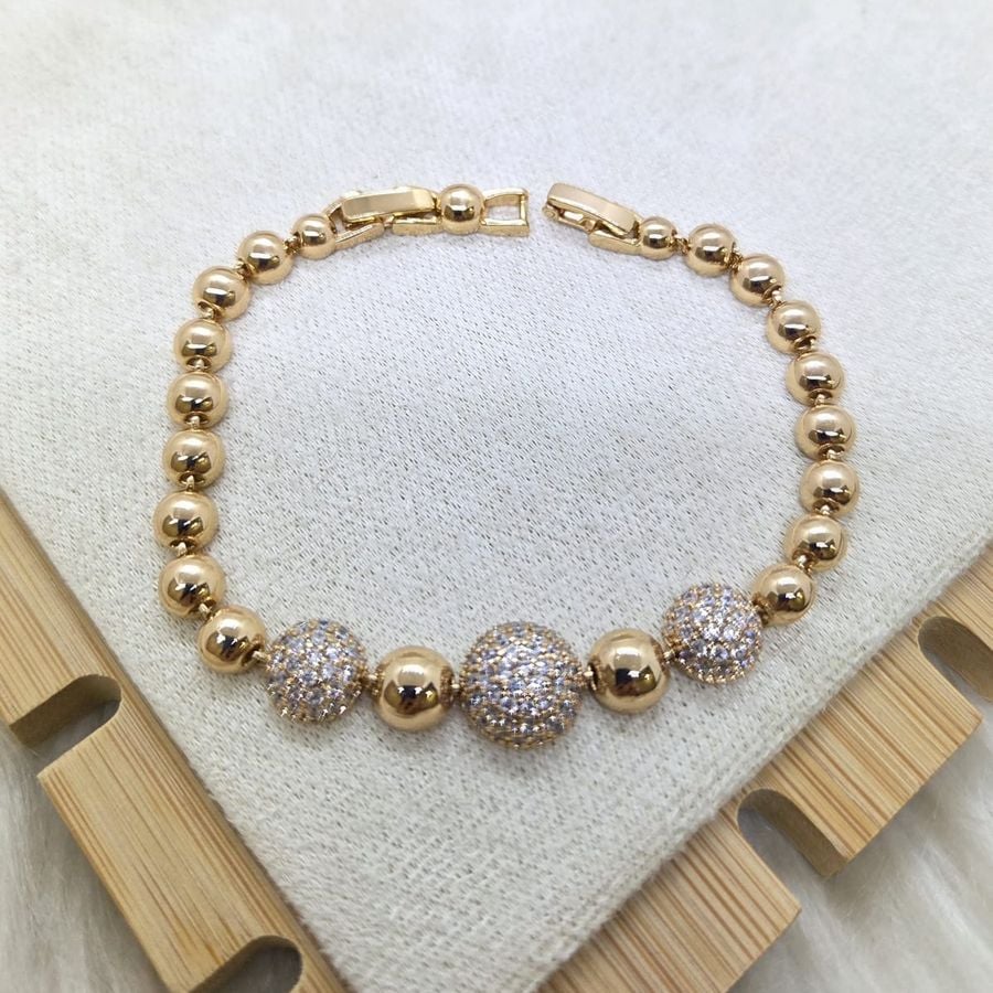 El punto focal de la joya es un trío de esferas centrales pavimentadas. Estas cuentas presentan una micro-incrustación completa de puntos de luz que capturan la luz desde cualquier ángulo, creando un efecto de brillo intenso y lujoso. Las tres esferas brillantes están intercaladas rítmicamente con las esferas pulidas, logrando un equilibrio perfecto entre la elegancia sobria y el deslumbrante glamour.